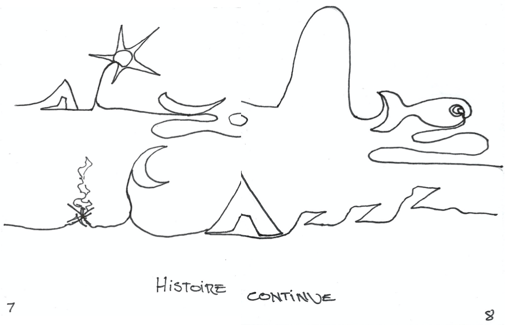 6. Démonstration — Tracer une ligne continue au fil d’une histoire racontée (p. ex. : La journée d’un chasseur… il quitte sa tente, le soleil se lève, il prend son canot, il longe une montagne, il pêche un gros poisson, il fait un feu, la lune monte dans le ciel, il va dormir et ronfle). Utiliser un crayon à mine d’abord, puis retracer au crayon-feutre noir, pages 7 et 8. (Pour éviter de laisser des taches, toujours placer un papier sous le dessin.)