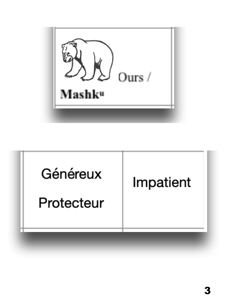 8. Accroître son estime de soi — À l’aide d’un document sur les forces et des faiblesses des animaux totems, encercler le nom de tous les adjectifs auxquels l’élève s’identifie. Choisir un animal selon les adjectifs encerclés. Découper et coller l’image ainsi que le nom de l’animal en langue innue, deux forces et une faiblesse, page 3.