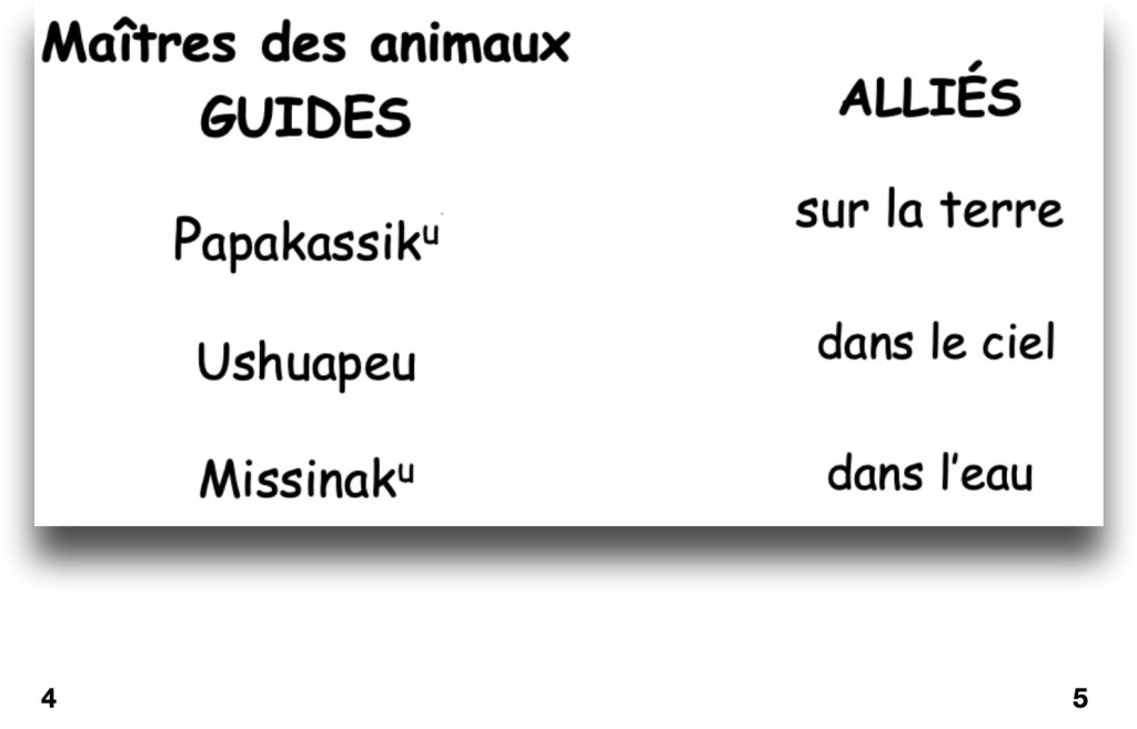 5. Se sensibiliser à un ensemble de valeurs de l’ordre du vivre-ensemble —Qu’est-ce que la culture ? C’est le comportement d’un humain dans un environnement donné. Écrire au tableau — Qui sont les maîtres des animaux selon la culture innue ? Selon diverses traditions, les connaissances transmises par les Anciens, les trois maîtres des animaux sont : Papakassiku est le maître de celui qui marche, Ushuapeu est le maître de celui qui vole, Missinaku est le maître de celui qui nage. Coller une photocopie, pages 4 et 5.