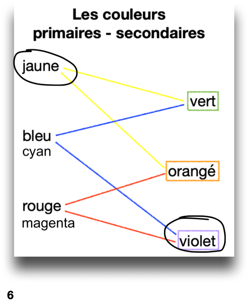 9. Consulter le tableau des couleurs (sur le TBI). Quelles sont les trois couleurs primaires ? Jaune, cyan (bleu) et magenta (rouge). Et les trois couleurs secondaires ? Violet, vert et orangé. Coller une photocopie, page 6. Comment trouver les couleurs qui ont le plus d’impact lorsqu’elles sont placées côte à côte ? Par exemple : prenons le jaune. Quelles sont les deux autres couleurs ? Le magenta (rouge) et le cyan (bleu). Quand on les mélange, on obtient du violet. Le violet est donc la couleur complémentaire du jaune. Choisir et entourer deux couleurs : la première couleur est primaire et la deuxième est secondaire.