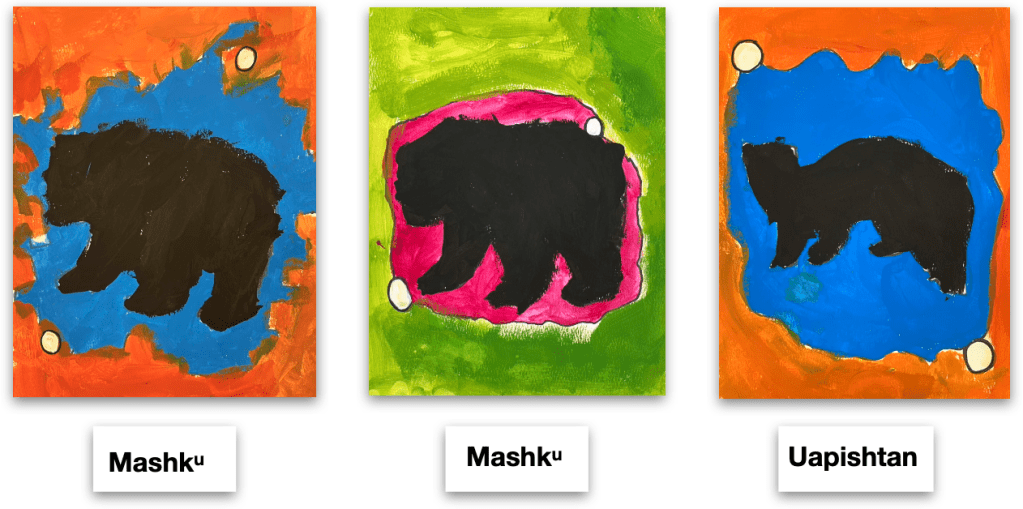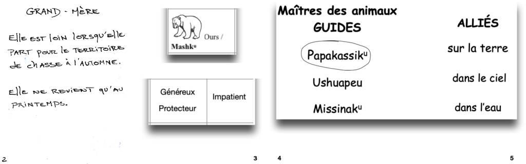 – L’élève entoure le nom du maître de son animal (p. ex. : celui du caribou est le maître de celui qui marche, Papakassiku), page 4. Il termine sa page couverture. *Notez que dans la culture innue, l’ours est son propre maître.