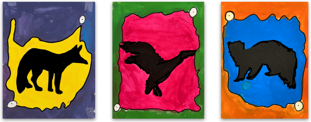 2. Réaliser une murale en utilisant les animaux de chaque élève : peindre un fond uniforme, jaune ou de couleur claire, sur un mur ou sur un grand carton. Dessiner les lignes de contour d’arbres et de feuillage. Photocopier et découper le contour des animaux. Retracer au crayon-feutre noir aux endroits appropriés (p. ex. : un hibou dans un arbre). Peindre toutes les formes en noir.