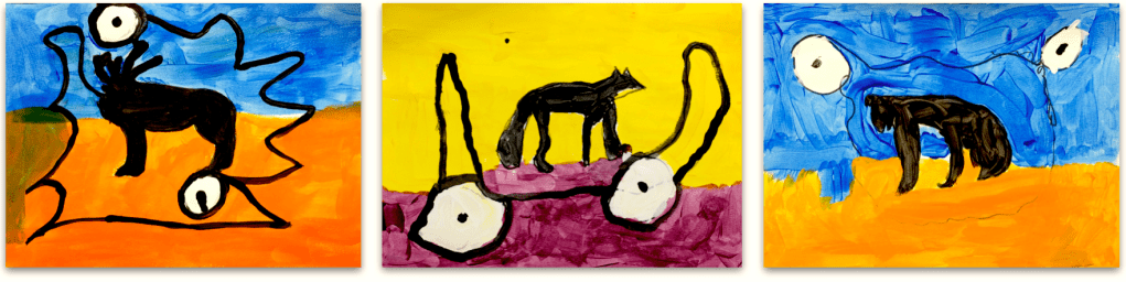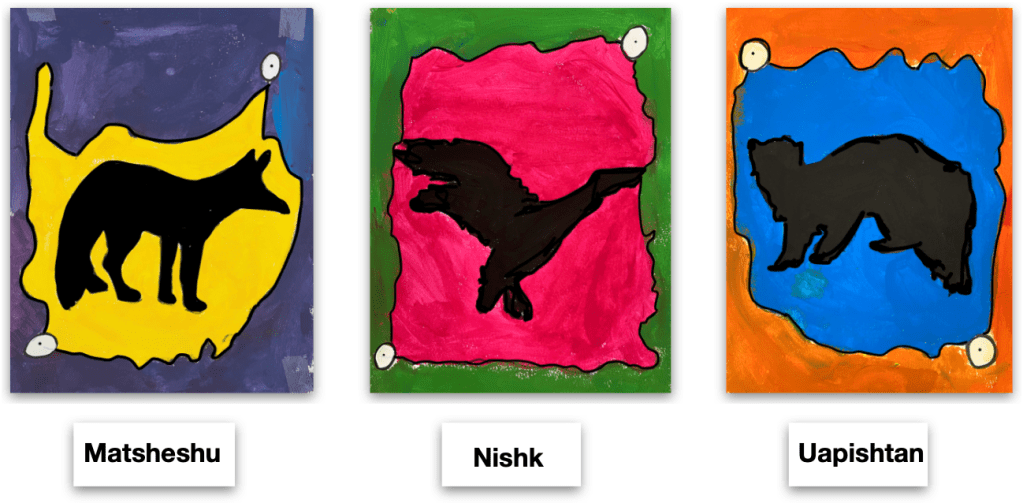 3. Réaliser une exposition : écrire sur une carte le nom du projet, de l’enseignant.e ainsi que l’année en cours et fixer en haut des réalisations ; écrire le nom de l’animal en langue innue sur une petite carte et placer sous chaque réalisation.
