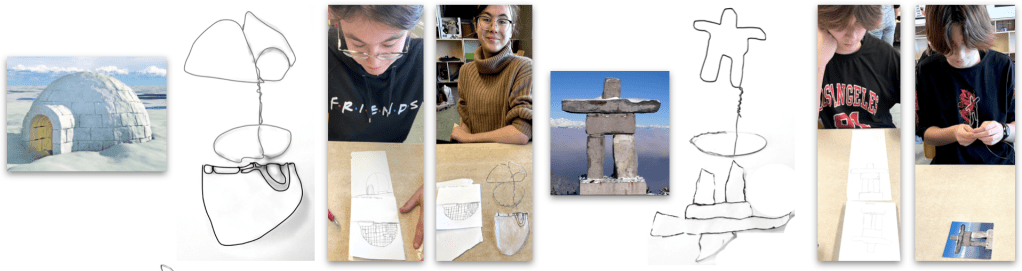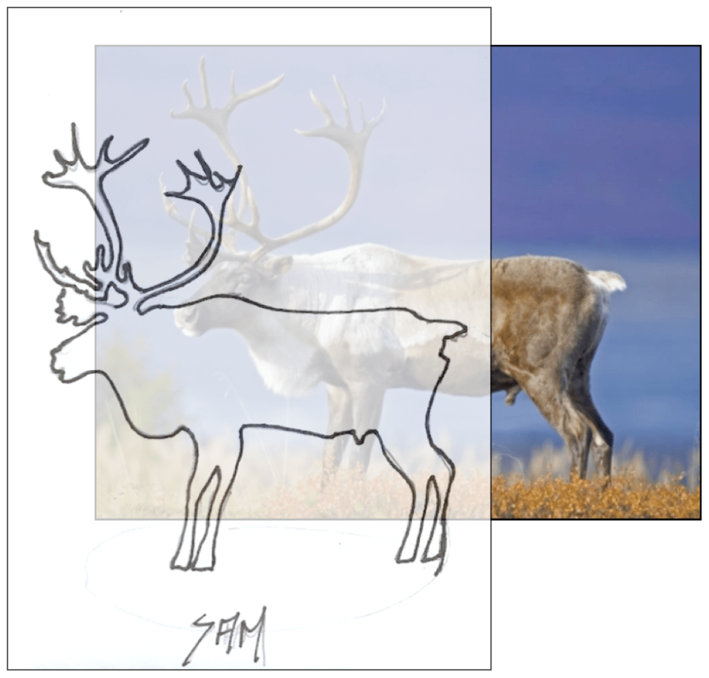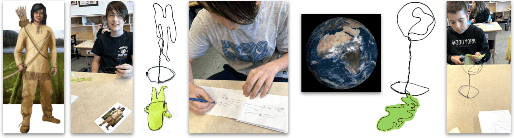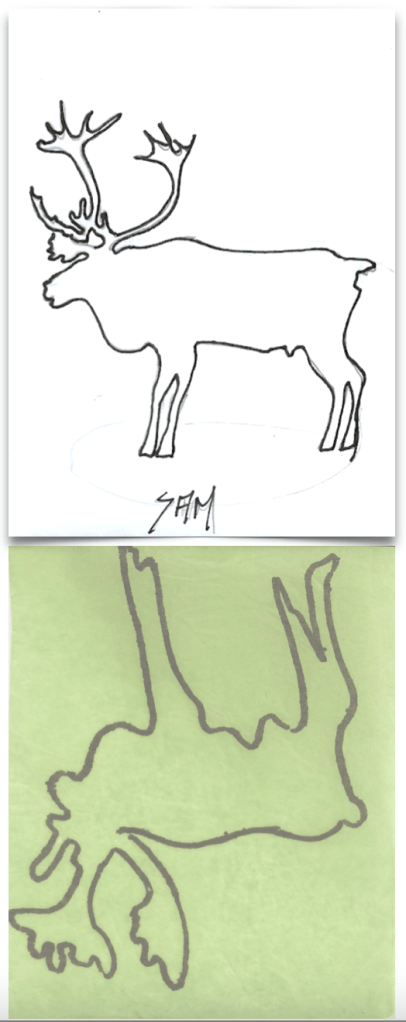 11. Démonstration — Comment styliser un dessin : sur un papier régulier, et à partir du dessin de la page couverture du carnet de traces, dessiner de nouveau l’élément au crayon à mine, mais cette fois, à l’envers (ce croquis servira à réaliser l’ombre de la sculpture). Retracer le dessin « à l’envers » sur un morceau de papier de soie, au crayon-feutre noir, en ajustant si nécessaire. LORSQUE TERMINÉ, insérer le papier de soie dans le carnet de traces.