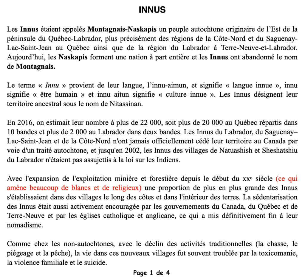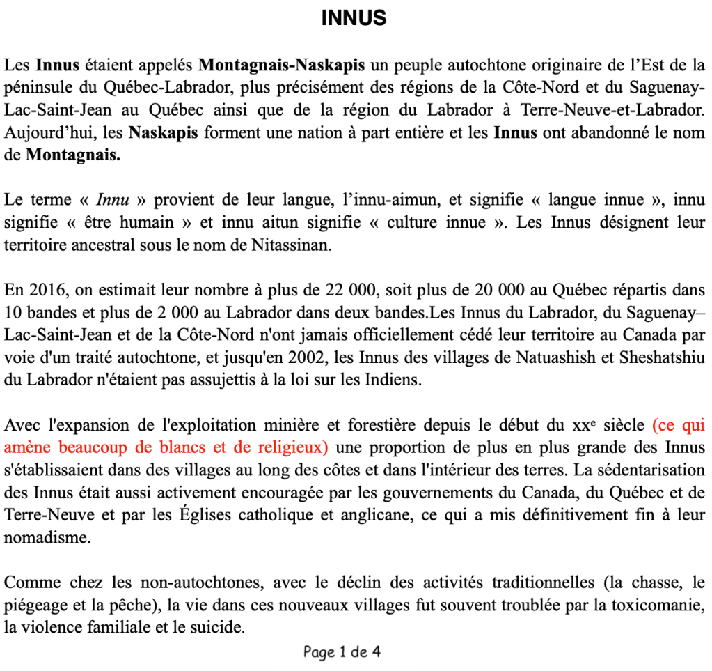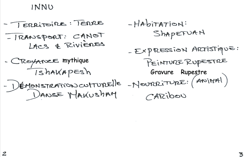 2. Visionner la vidéo sur le mode de vie innu — Trois Nations — Production Manitu inc. Durée : 5 min 4 s. Trouver des exemples ou des situations servant à démontrer que la langue innue est encore bien vivante dans la communauté — Qu’est-ce que INNU NIKAMU ? C’est un festival de musique qui a lieu tous les ans depuis 40 ans à Mani-utenam, l’une des onze communautés innue du Québec.