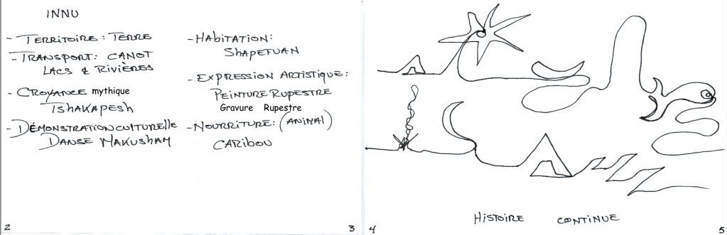 – L’enseignant s’assure que les éléments suivants figurent dans les carnets de traces : ligne continue (pages 4 et 5), lignes de contour d’une image (page couverture), dessin à l’envers (papier de soie), nom d’un élément culturel, informations pertinentes (page 6).