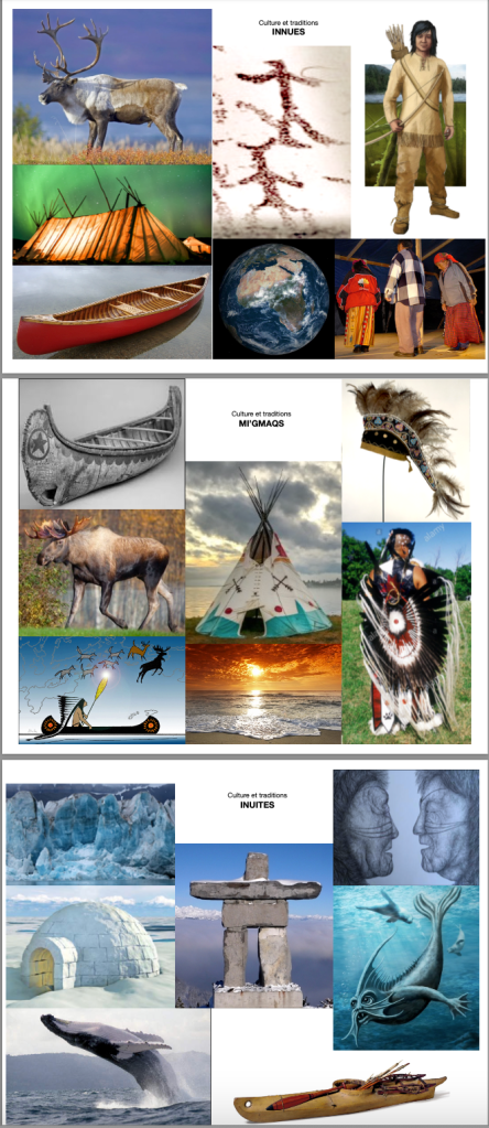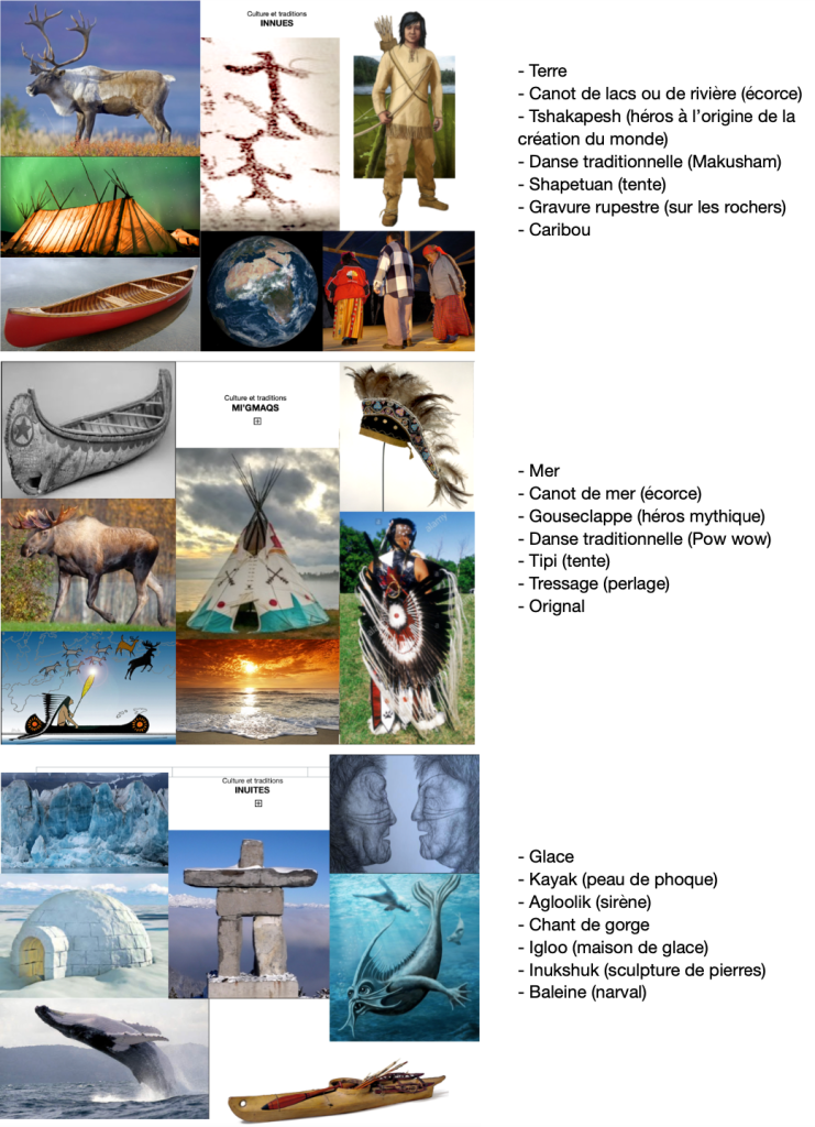 4. Prendre connaissance d’un problème — Ouvrir une discussion sur le mode de vie des trois nations : innue, mi’gmaq et inuite. Ont-ils toujours accès aux mêmes ressources ? À l’aide du document sur les caractéristiques culturelles (sur le TBI), définir les ressemblances et les différences suivantes : territoire, transport, croyance, démonstration culturelle, habitation, expression artistique et nourriture. Au tableau — Séparer en trois colonnes (trois nations), écrire les sept caractéristiques pour chaque nation.