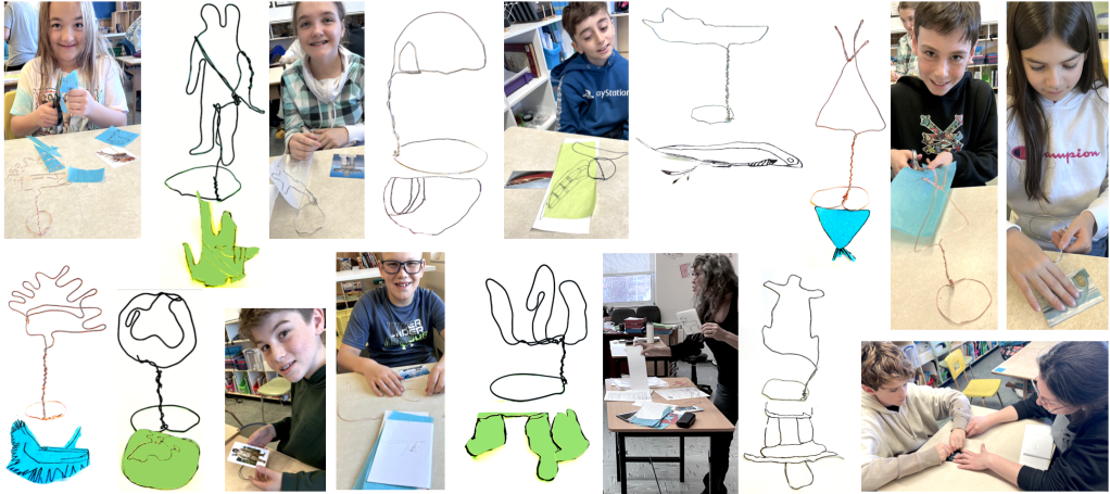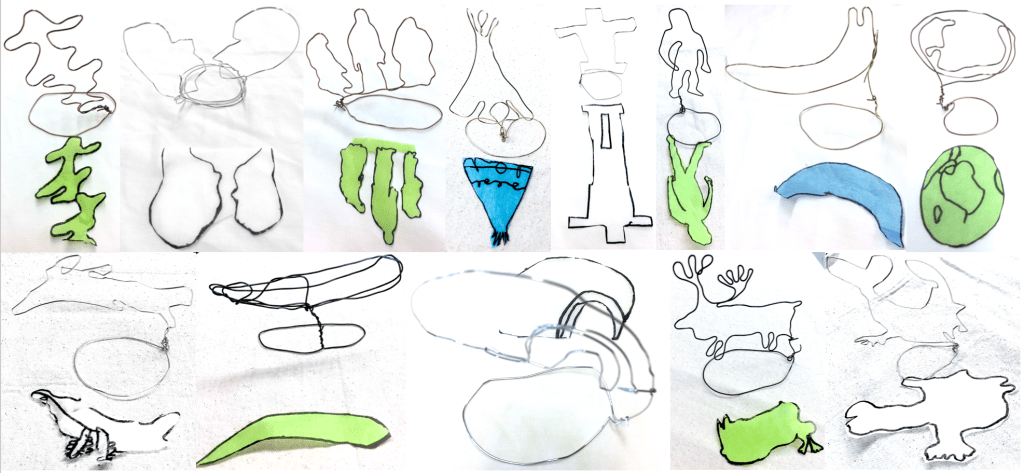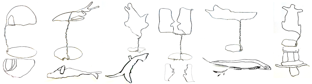 13. Démonstration — Modelage : plier le fil de fer en commençant par une extrémité, utiliser le fil de fer tel un crayon, et de la même façon (en suivant les lignes de contour du dessin de la page couverture, de la photographie ou du papier de soie). Pour changer de direction, appuyer fermement à l’intersection de celle-ci et diriger avec force le fil de fer. Accentuer les lignes afin de donner forme à la sculpture.