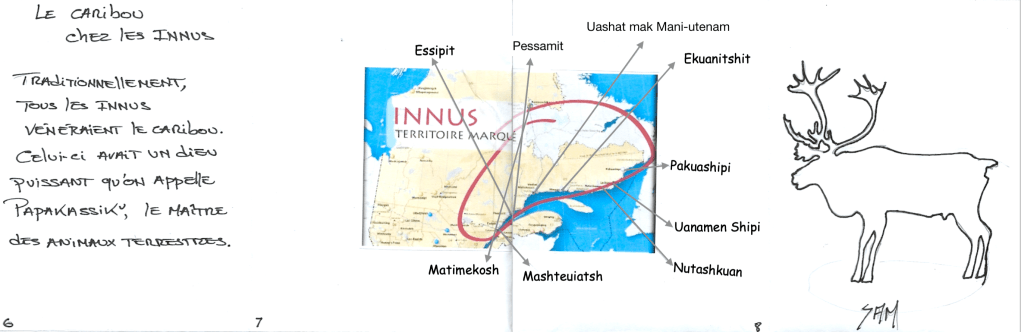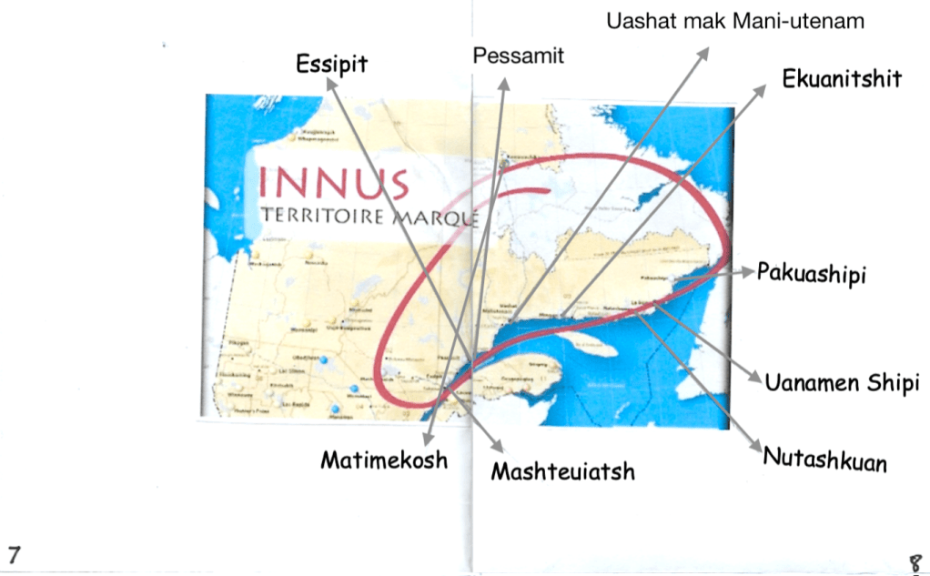 6. Situer les communautés innues sur une carte — Coller une carte géographique au centre des pages 7 et 8. Consulter les trois cartes géographiques (sur le TBI) — En équipe (tous les élèves ayant pigé le même territoire), trouver le nom des villes appartenant au territoire. Écrire autour de la carte en utilisant des flèches pour plus de précision.