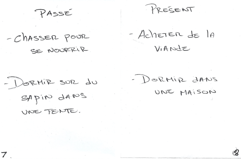 – L’enseignant s’assure que les éléments suivants figurent dans les carnets de traces : nom, image, forces et faiblesses d’un animal, nom d’animal en langue innue souligné (page 2), nom, image, forces et faiblesses de l’animal d’un pair, nom d’animal en langue innue souligné (page 3), animal coller et ligne de contour retracer (page couverture), résolution d’un problème (page 6).
