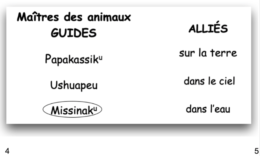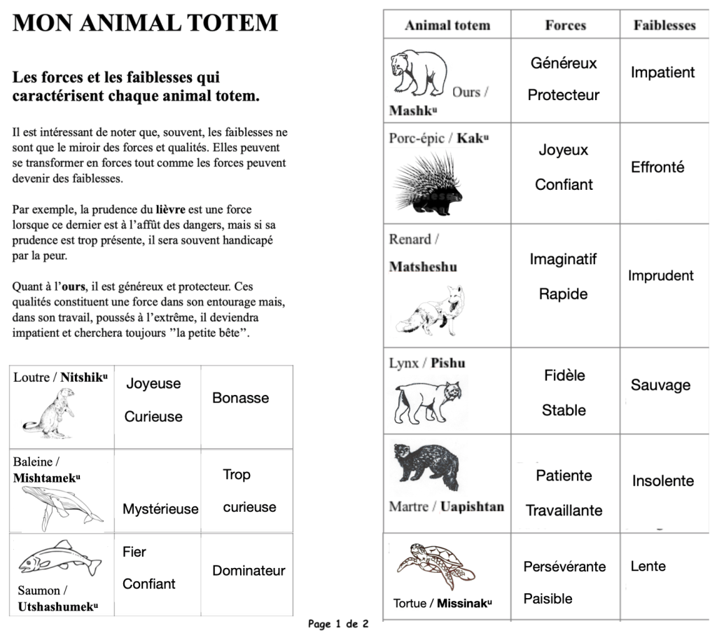 Page 4 : coller une photocopie du nom des trois maîtres des animaux (guides alliés) selon diverses traditions transmises par les Anciens.