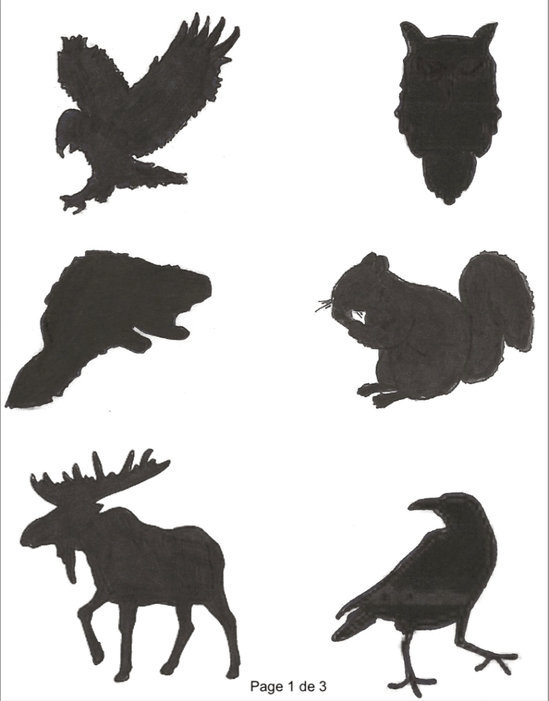 7. Découper l’image de l’animal choisi sur la ligne de contour et coller sur la page couverture. Écrire de nom de l’animal en langue innue en haut de la page. Retracer la ligne de contour au crayon-feutre noir.