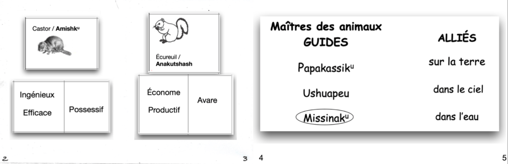 5. Ouvrir une discussion sur diverses traditions (guides et alliés) transmises par les Anciens. Écrire au tableau le nom des trois maîtres des animaux et la catégorie correspondante. Coller une photocopie, pages 4 et 5. Entourer le nom du maître de l’animal choisi.