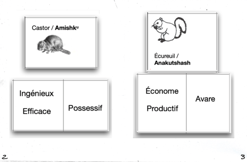 6. Porter un regard critique sur les raisons qui appuient son choix — À l’aide d’un document sur l’animal totem, écrire une liste des tempéraments reliés aux animaux de la forêt : une force et une faiblesse (p. ex. : le castor est méthodique et possessif). Choisir une force et une faiblesse auxquelles l’élève s’identifie, découper et coller le nom, l’image, deux forces et une faiblesse, page 2. Coller le nom, l’image, les forces et les faiblesses d’un pair, page 3.