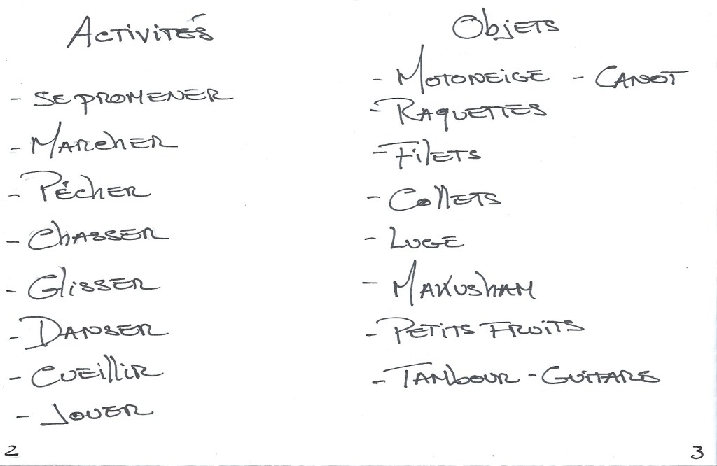 4. Nommer les jeux des enfants selon les saisons — Écrire au tableau des activités pratiquées par les Innus. Choisir et écrire trois activités, page 2 (p. ex. : marcher, pêcher, chasser). Trouver et écrire les objets utilisés pour pratiquer ces activités (p. ex. : raquettes, filets, collets). Écrire trois activités, page 3.