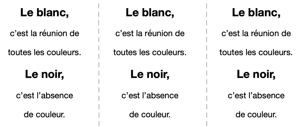 – une courte définition du blanc et du noir en art visuel, format env. 3 x 3 po (1 par élève).