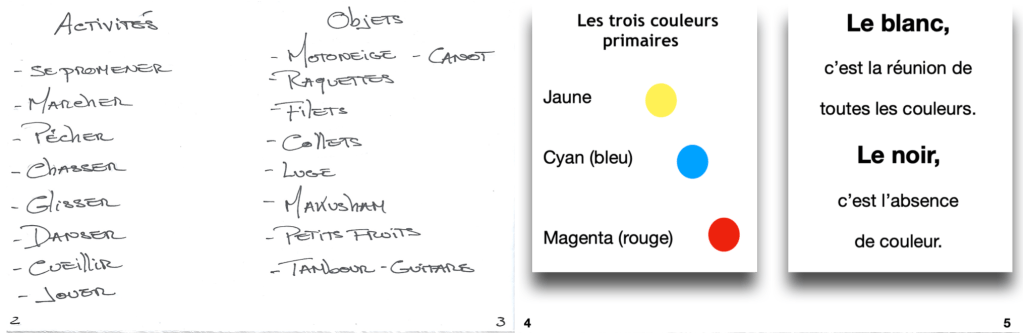 *Bien qu’il y ait plusieurs noms d’objets, d’activités, de valeurs et plusieurs éléments dans mon carnet de traces, les élèves n’en écrivent que trois.
