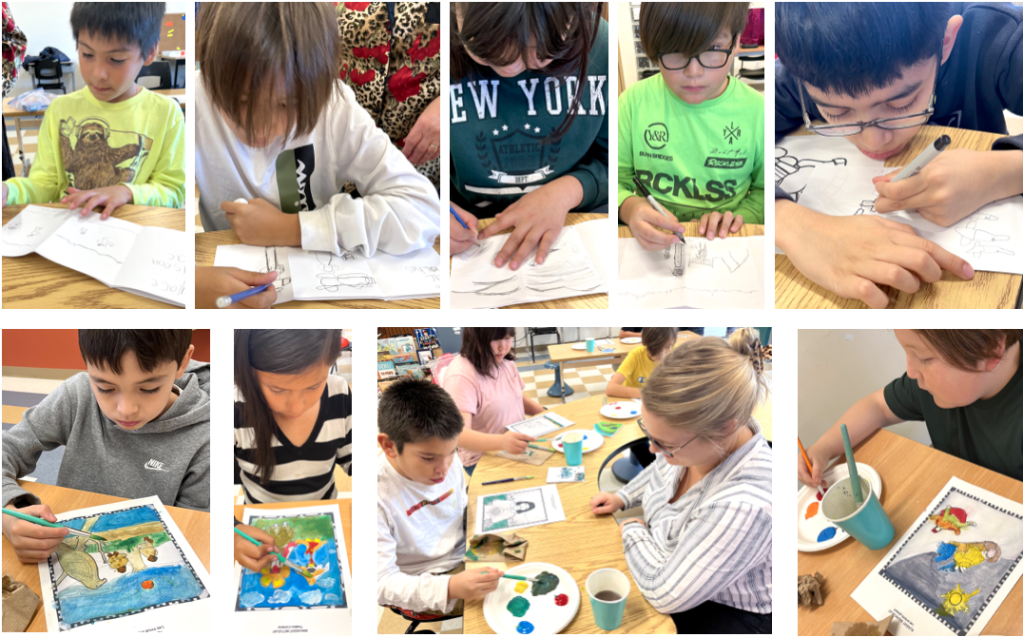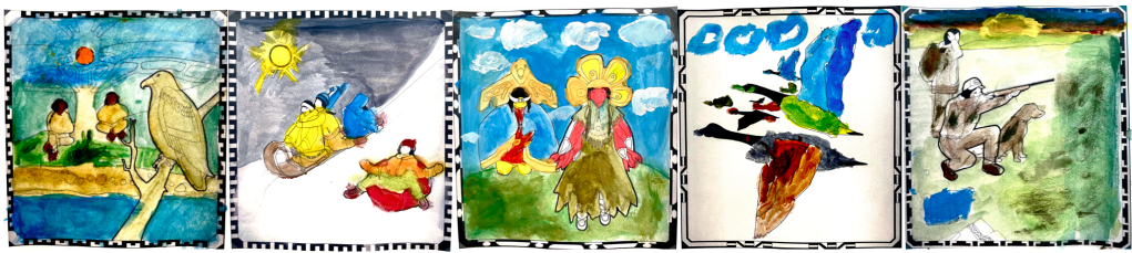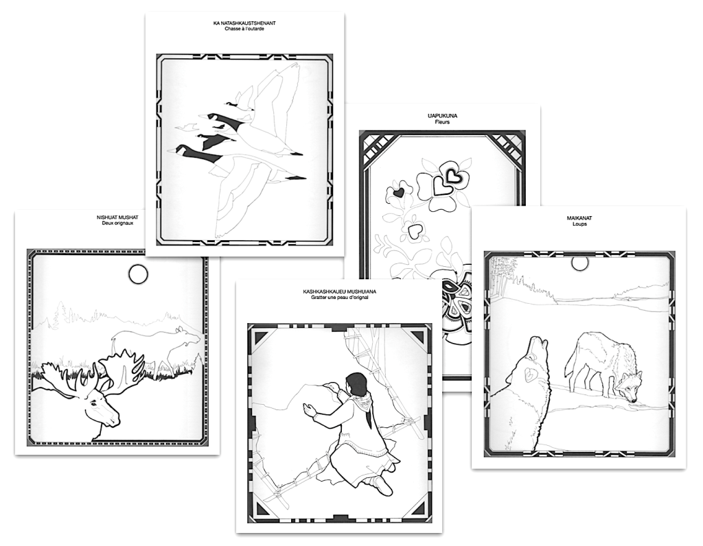 2. Réaliser une exposition : écrire son nom sur une petite carte, découper et fixer la phrase ou le mot en langue innue (apparaissant au bas de l’image choisie) et placer sous chaque réalisation ; écrire le titre du projet et de l’enseignant.e sur une carte et placer en haut des réalisations.
