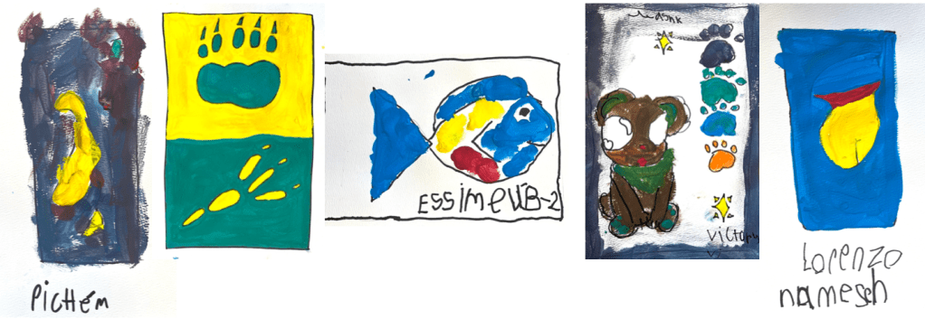 PAGE COUVERTURE : écrire son nom en bas, au centre ; dessiner le contour d’un élément choisi en fonction de sa signification ; écrire le nom de l’objet ou de l’élément choisi en langue innue, en haut, au centre. Voir :