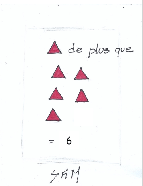 5. Situation-problème — Résoudre son équation à l’aide de figures planes sur la page couverture du carnet de traces (p. ex. : 1 de plus que 5 = 6). Retracer la ligne de contour des figures planes au crayon-feutre noir. (Pour éviter les taches, placer une feuille entre la page couverture et la page 2.)