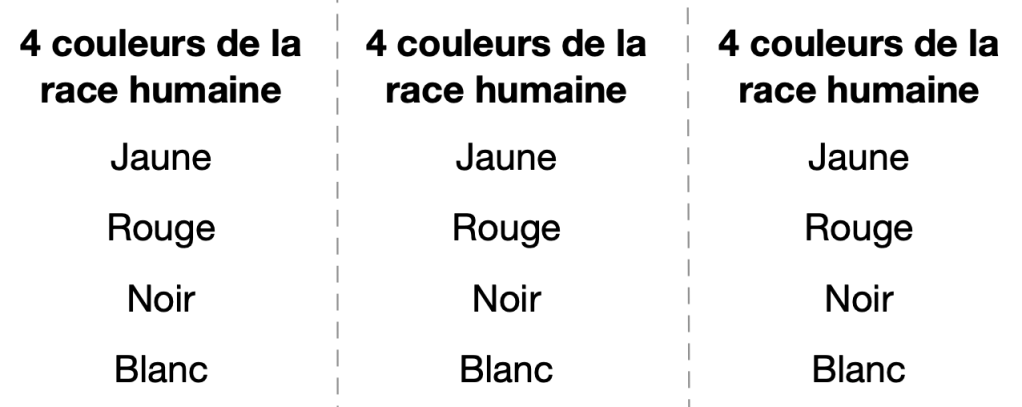 – la liste des 4 couleurs de la race humaine, format env. 3 x 3 po (1 par élève).