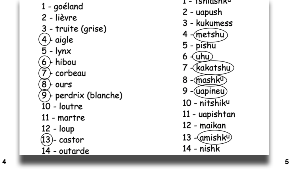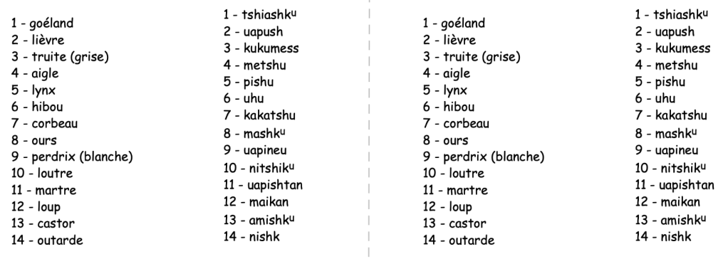 – une photocopie de la liste des noms d’animaux en français et en innu