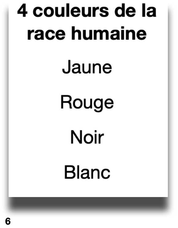 9. Quelles sont les couleurs de la race humaine selon les Premières Nations ? Blanc, noir, jaune et rouge. Coller une photocopie, page 6.