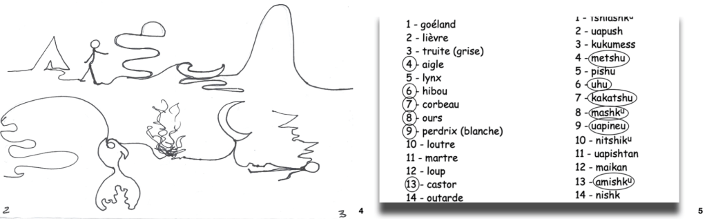Page 5 : coller une photocopie de nom d’animaux en langue innue ; entourer le nom des animaux choisis en langue innue.