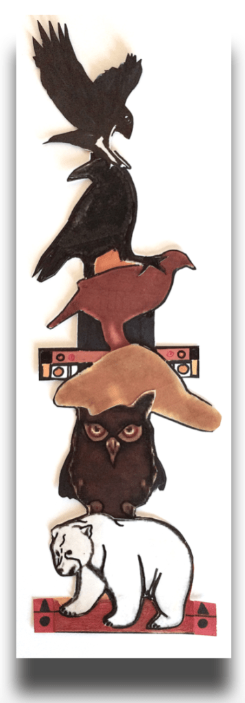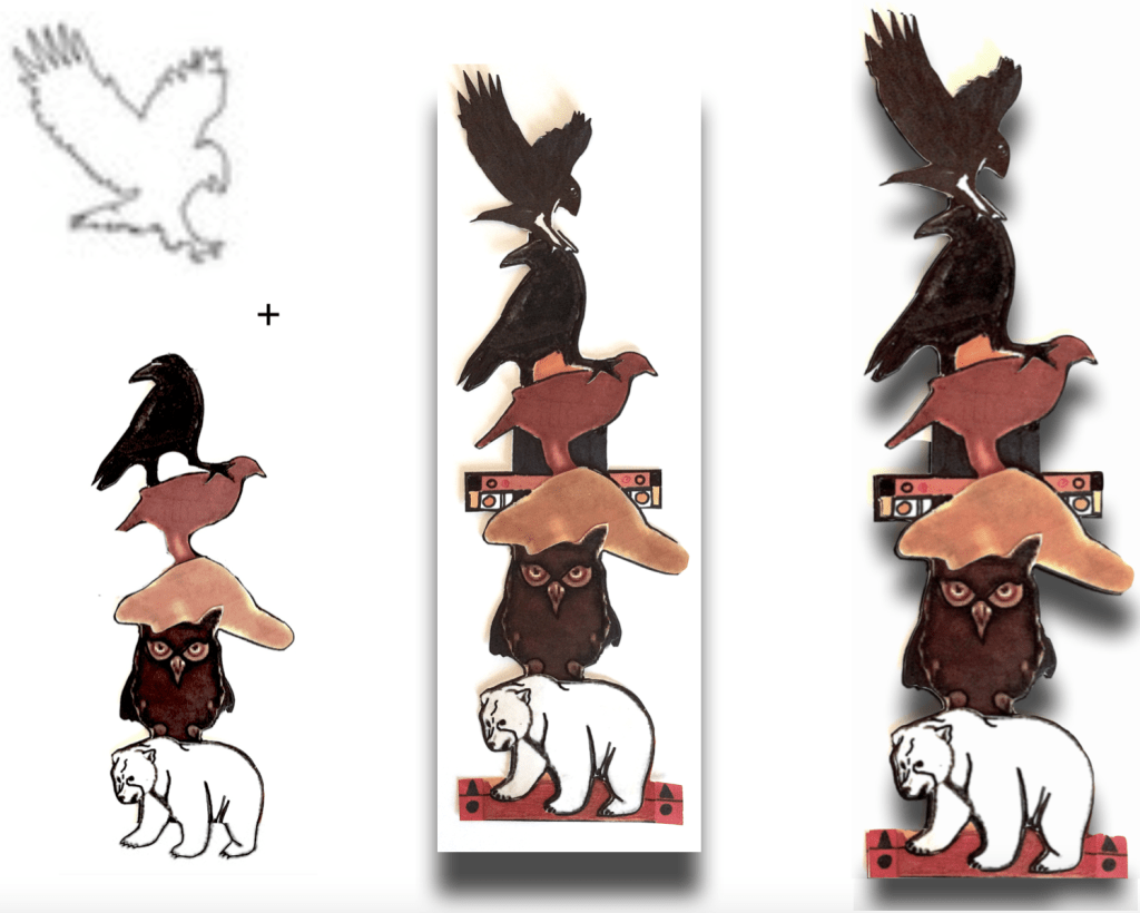 13. Coller le totem sur un carton blanc et retracer les lignes de contour au crayon-feutre noir. Dessiner des figures planes afin de compléter la composition. Ajouter de la couleur et du noir (p. ex. : ajouter du noir à l’intérieur de l’aigle blanc).