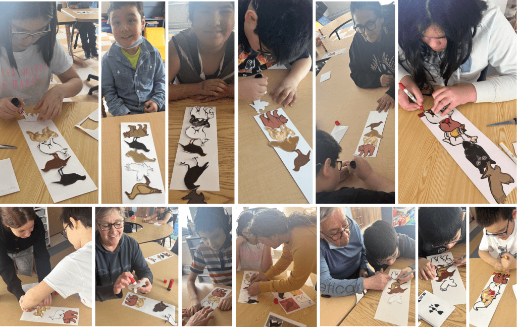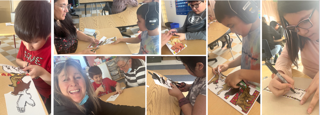 – L’enseignant s’assure que les éléments suivants figurent dans les carnets de traces : ligne continue (pages 2 et 3), le numéro correspondant à chaque animal choisi entouré (page 4), le nom de chaque animal entouré (en langue innue) (page 5), les quatre couleurs de la race humaine (page 6).