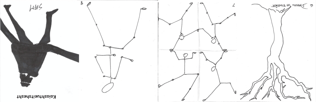 10. Diviser la page 7 du carnet de traces en quatre sections égales et dessiner quatre bonshommes allumettes de façon à ce qu’ils touchent les mains ainsi qu’aux quatre côtés du carré.