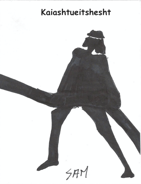 PAGE COUVERTURE : écrire son nom en bas, au centre ; dessiner les lignes de contour d’un personnage ; écrire le nom du métier sélectionné en innu-aimun en haut de la page. Voir :