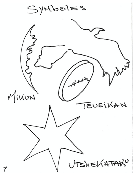8. Écrire au tableau – Quelles sont les émotions reliées aux mots-clés ? Par exemple : un aigle (ou une plume), un tambour, une étoile. Trouver et écrire les émotions (personnelles) reliées aux symboles de la page 7 à la page 8.