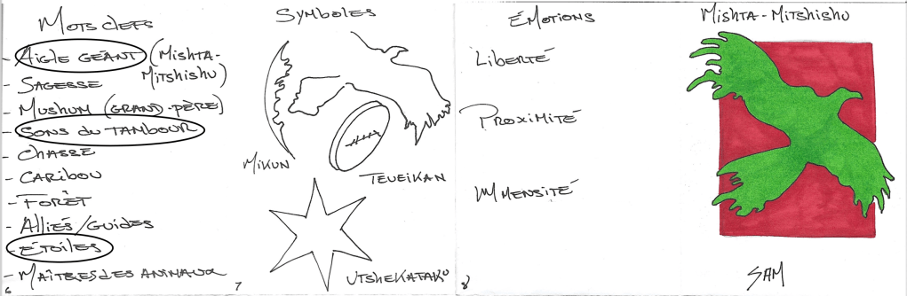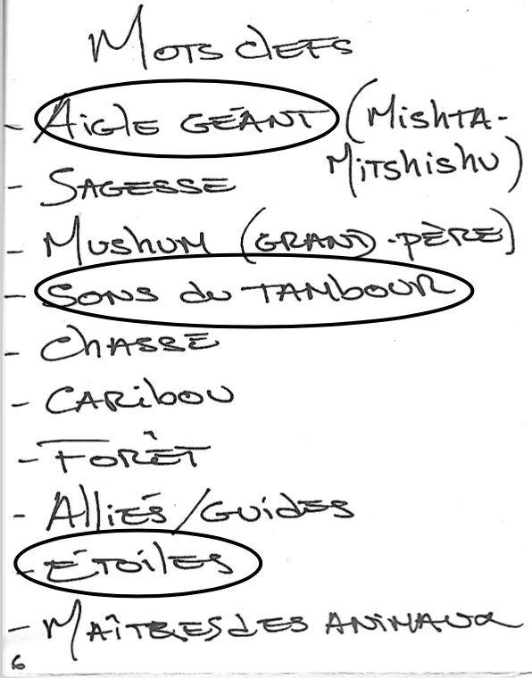 – Trouver ensemble les mots-clés en langue innue et écrire le sien sur sa page couverture, en haut du dessin (aigle/Metshu– grand aigle/Mishta Mitshishu, plume/mikun, tambour/teueikan, étoile/utshekataku, eau/nipi, loutre/nitshuku), voir : http://dictionnaire.innu-aimun.ca/Words.