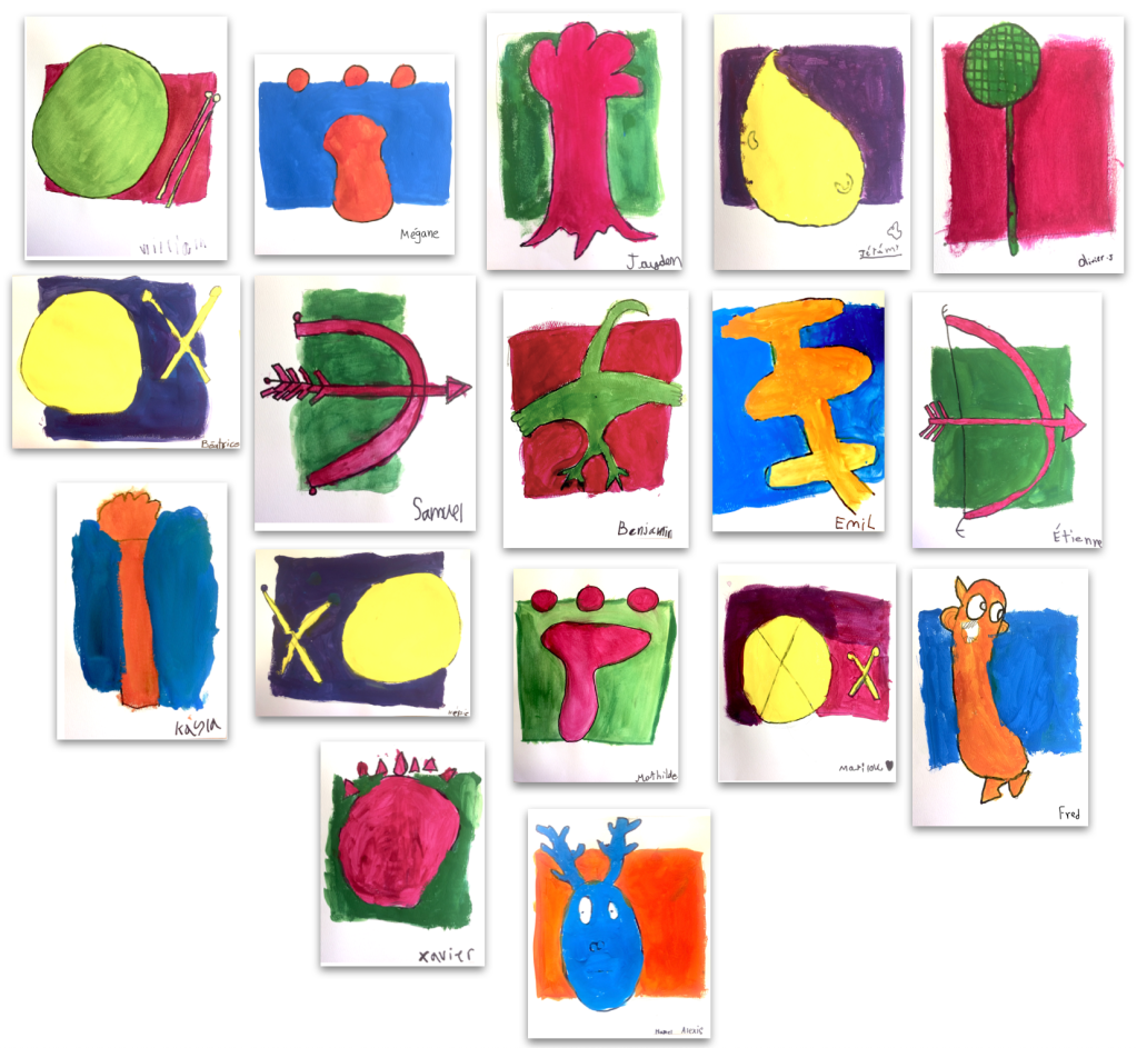 OU écrire le titre sur une carte (choisir entre une émotion ou tout autre mot relié au symbole, voir les pages 6, 7 et 8 du carnet de traces) ; ajouter le prénom et le nom de l’élève ainsi que l’année scolaire (on peut ajouter le numéro de groupe) ; fixer sous chaque réalisation.