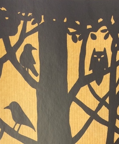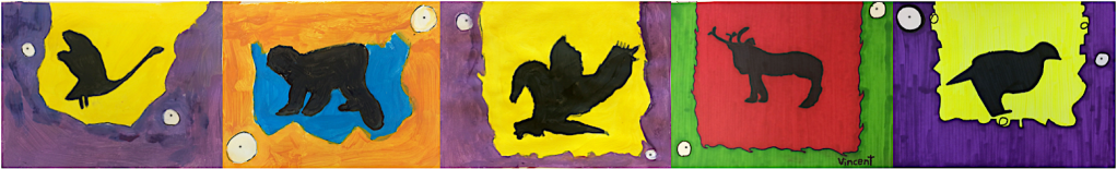 3. Réaliser une murale en utilisant les animaux de chaque élève : peindre un fond uniforme, jaune ou de couleur claire, sur un mur ou sur un grand carton. Dessiner les lignes de contour d’arbres et de feuillage. Photocopier et découper le contour des animaux. Retracer au crayon-feutre noir aux endroits appropriés (p. ex. : un hibou dans un arbre). Peindre toutes les formes en noir.