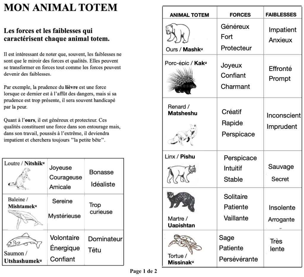 Imprimer (recto verso) le tableau des forces et des faiblesses des animaux totems (1 par élève).