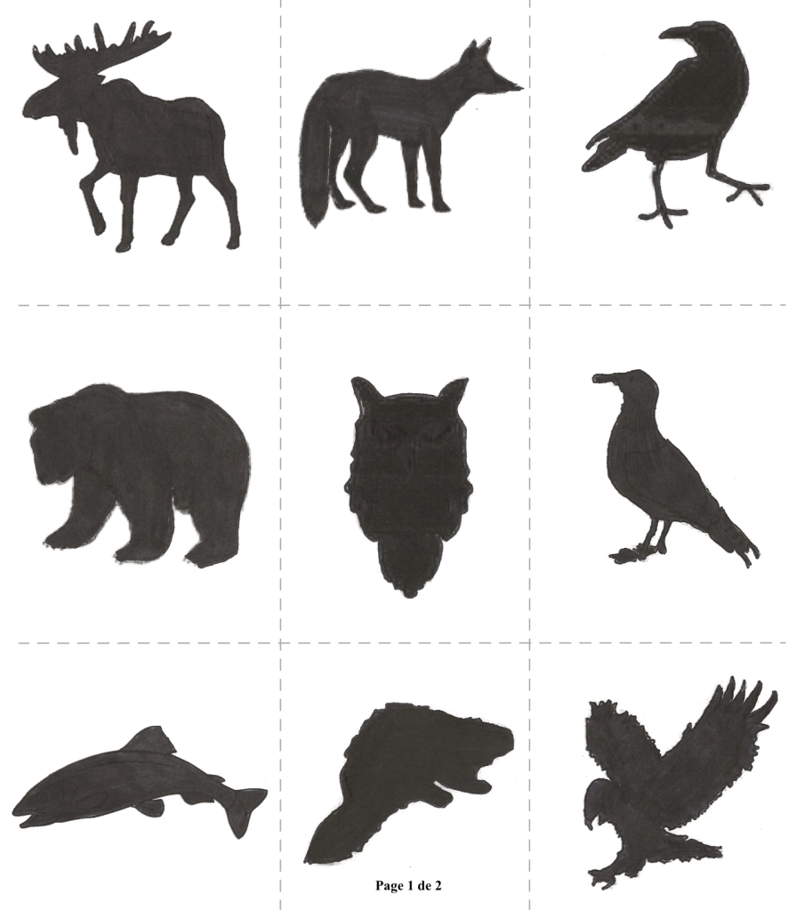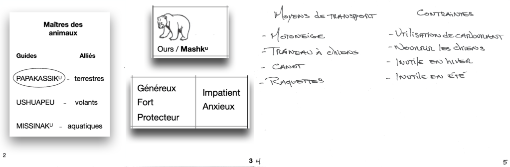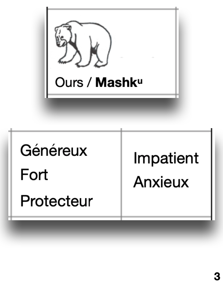8. Entourer le nom du maître de son animal, page 2. Découper et coller l’image ainsi que le nom de l’animal choisi en langue innue (innue-aimun), les forces et les faiblesses, page 3.
