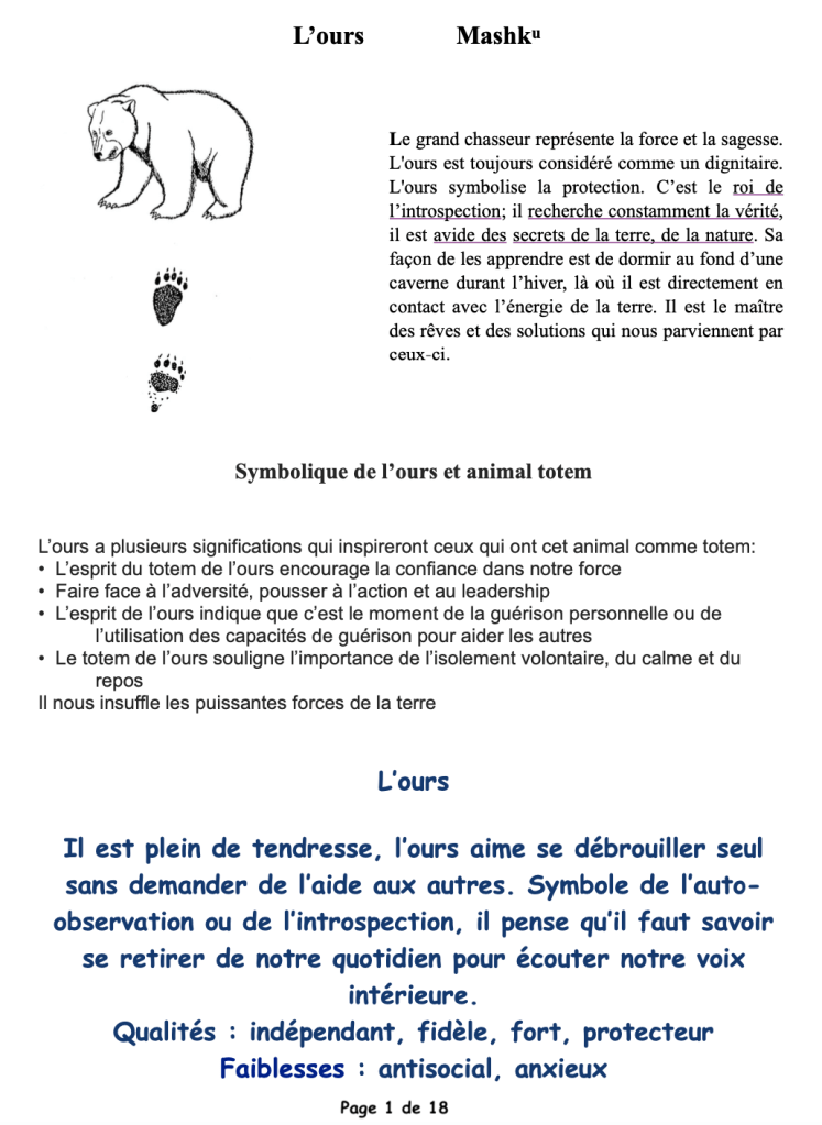 – une photocopie du tableau des forces et des faiblesses des animaux totems