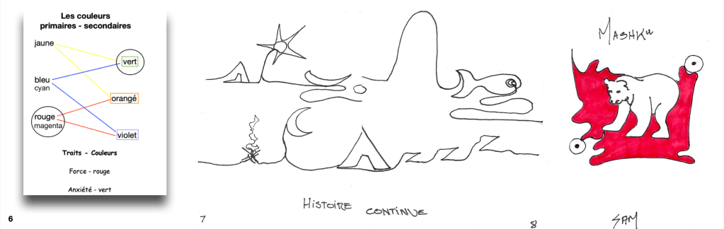 Page 6 : coller une photocopie des couleurs primaires et secondaires ; entourer deux couleurs ; écrire deux traits de caractère ainsi que deux couleurs.