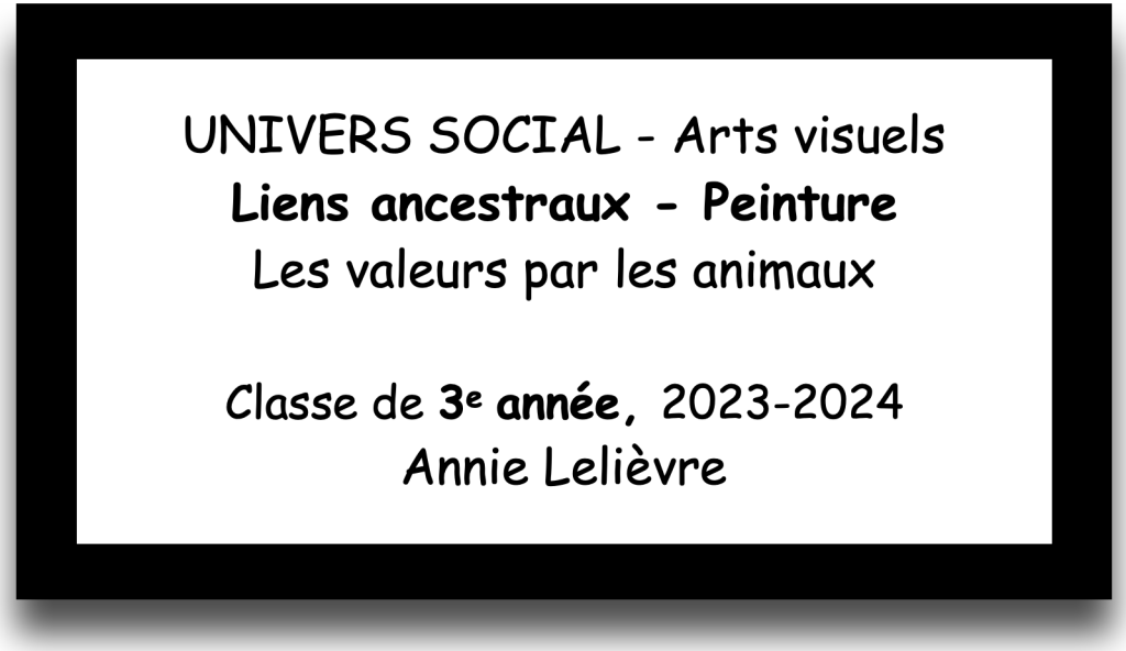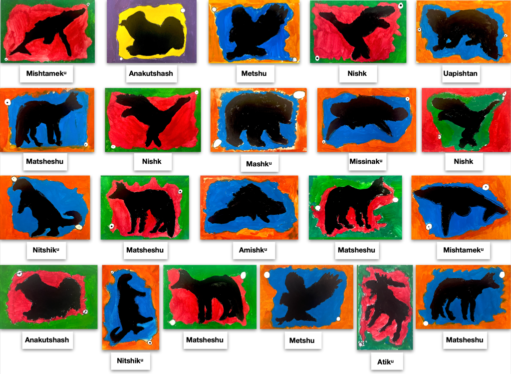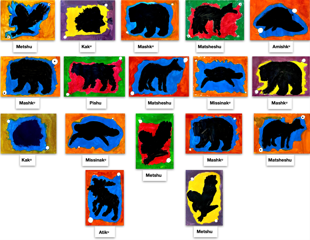 2. Réaliser une exposition : écrire les noms d’animaux en langue innue sur des petites cartes et placer sous chaque réalisation ; écrire sur une carte le titre du projet, de l’enseignant.e ainsi que l’année en cours et fixer en haut des réalisations.