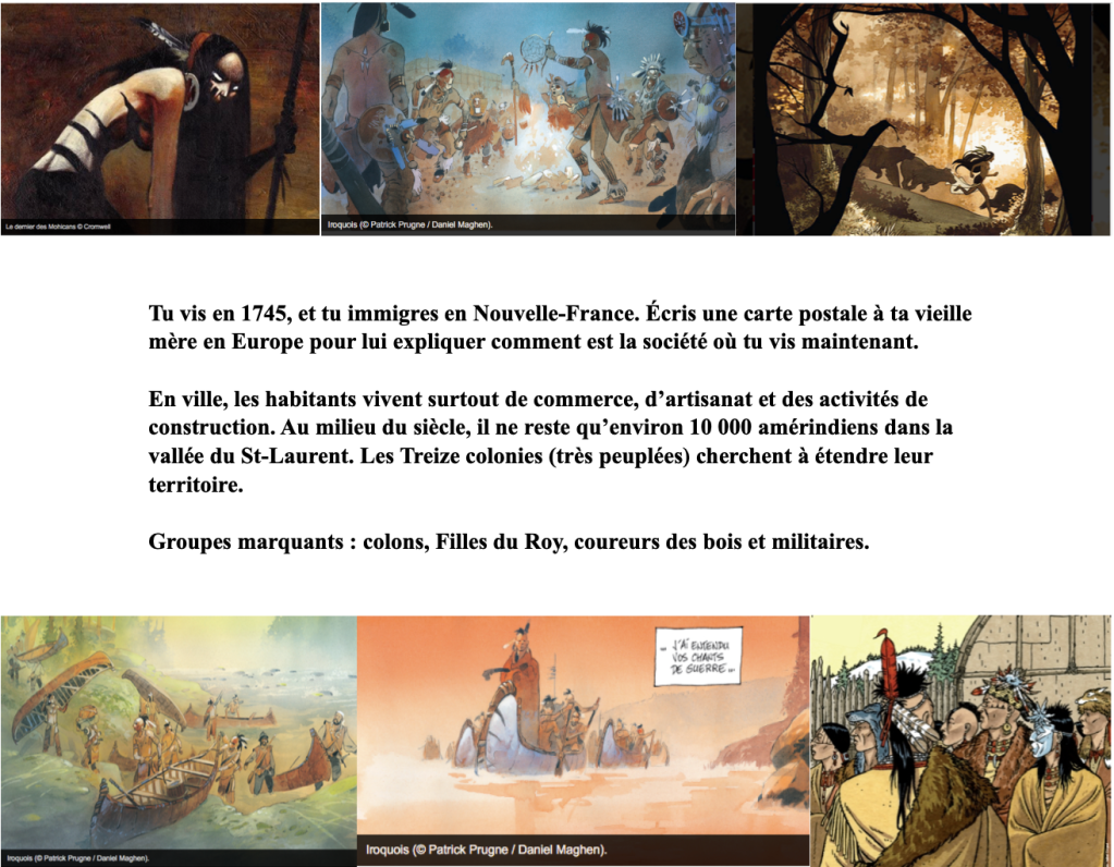 Page 6 : écrire le nom des personnages que l’on pouvait trouver en Nouvelle-France en 1745 ; entourer le nom d’un personnage.