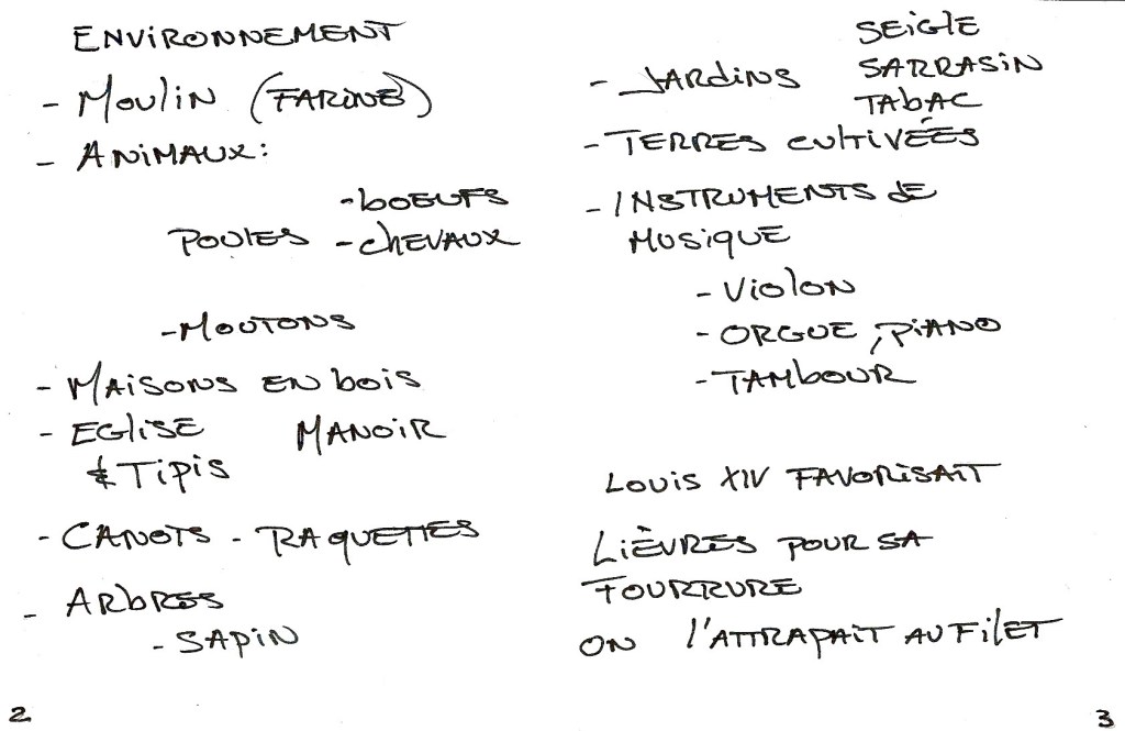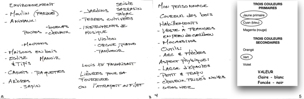 *Bien qu’il y ait plusieurs éléments qui constituent l’environnement de la Nouvelle-France en 1745 et plusieurs métiers dans mon carnet de traces, les élèves n’en écrivent que quatre ou cinq.