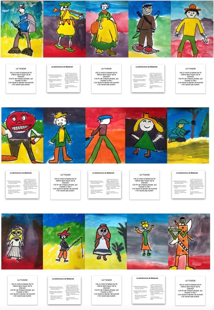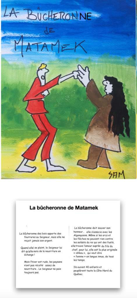– L’élève rédige une lettre dans laquelle il se décrit à la 3e personne du singulier. Cette lettre servira de synopsis, pages 7 et 8. Signer la lettre d’un nom qui en dit long (p. ex. : tu es bûcheron… LA BÛCHERONNE DE MATAMEK). Écrire le titre en haut de la page couverture.