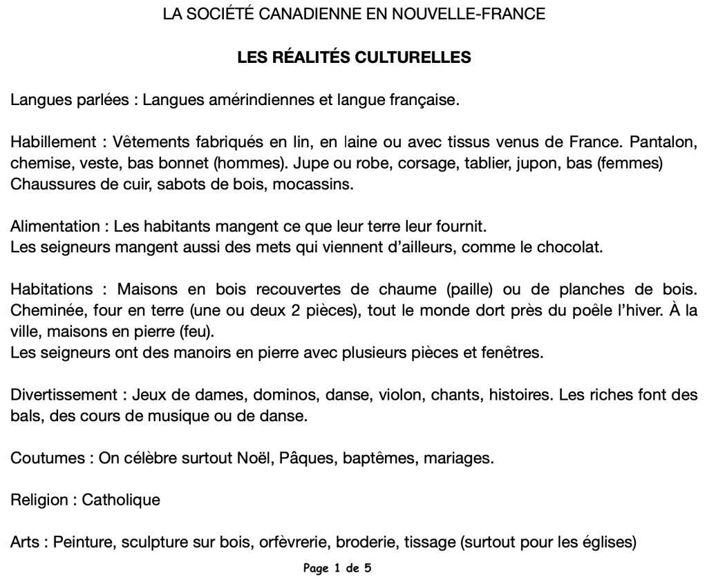 – le document sur les réalités culturelles de la société canadienne en Nouvelle-France pour consultation