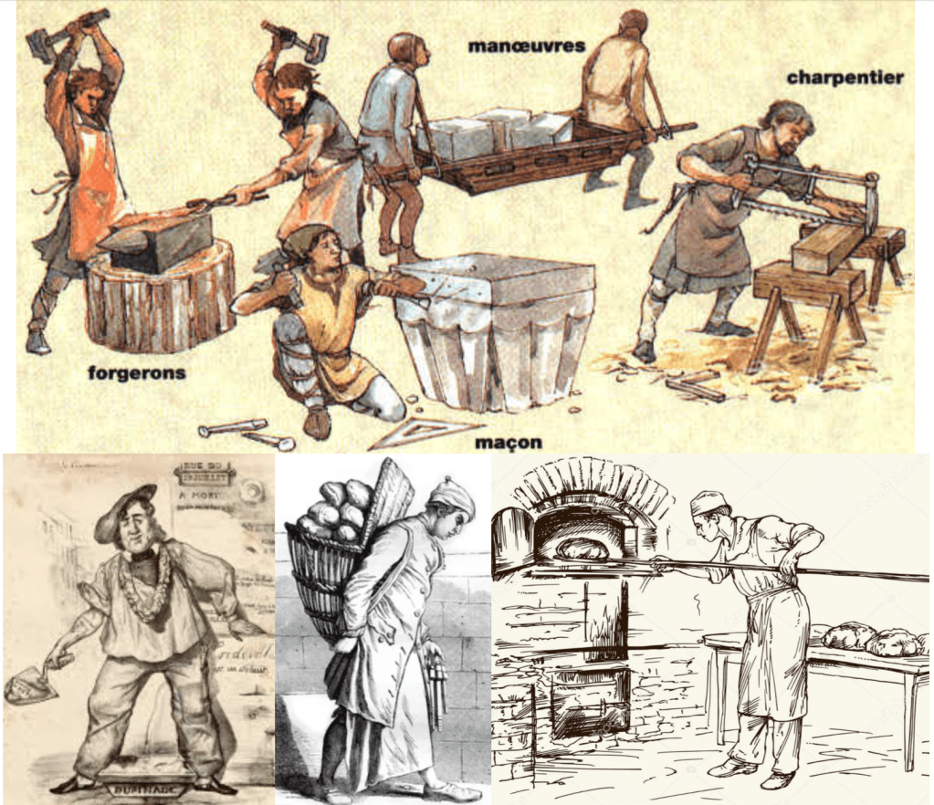 6. Consulter des scènes de vie (sur le TBI) et trouver les personnages et les métiers exercés (p. ex. : forgeron, boulanger, charpentier, menuisier, etc.). Choisir et écrire quatre ou cinq métiers à la page 6.