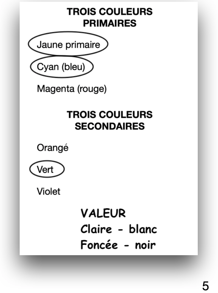 Page 5 : coller une photocopie des trois couleurs primaires et secondaires ; entourer deux couleurs primaires et une secondaire ; écrire « valeur » et en dessous : « claire – blanc ; foncée – noir ».
