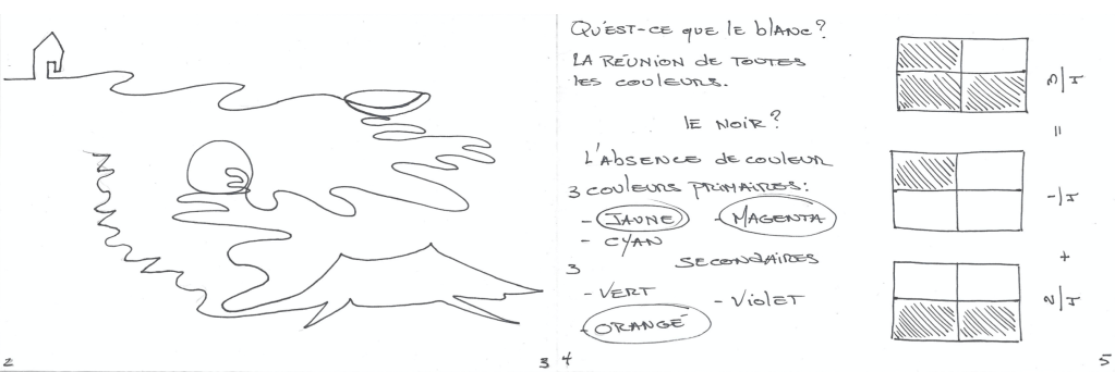 Page 4 : écrire les trois couleurs primaires et les trois couleurs secondaires ; écrire une brève description du blanc et du noir ; entourer les couleurs choisies (chaudes, froides).