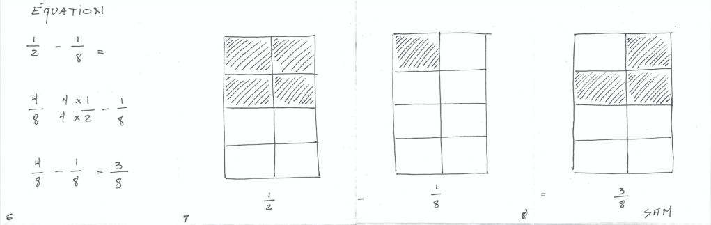 8. Refaire son équation en utilisant trois rectangles sur trois pages différentes, pages 7 et 8 et page couverture. Hachurer les parties des fractions en respectant celles de ses coéquipiers.