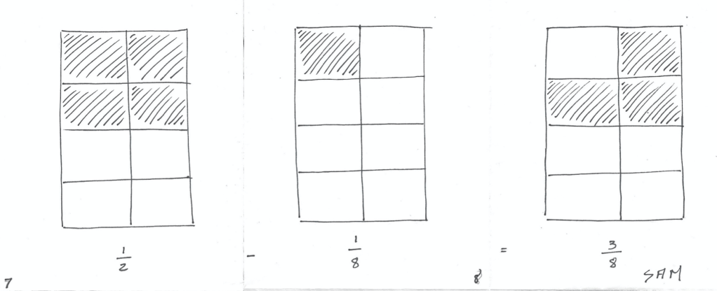 6. Qu’est-ce que le dénominateur ? C’est la partie d’une fraction qui indique en combien de parties l’unité est divisée (p. ex. : 1/2 – 1/8 = 3/8, 1/2 – 3/8 = 1/8, 3/8 + 1/8 = 1/2). Trouver le dénominateur commun.